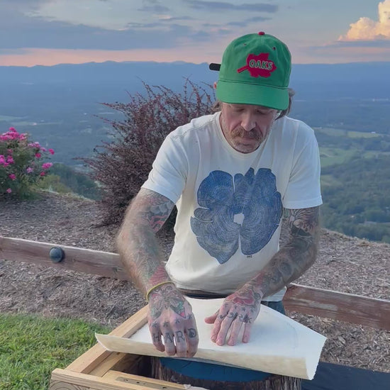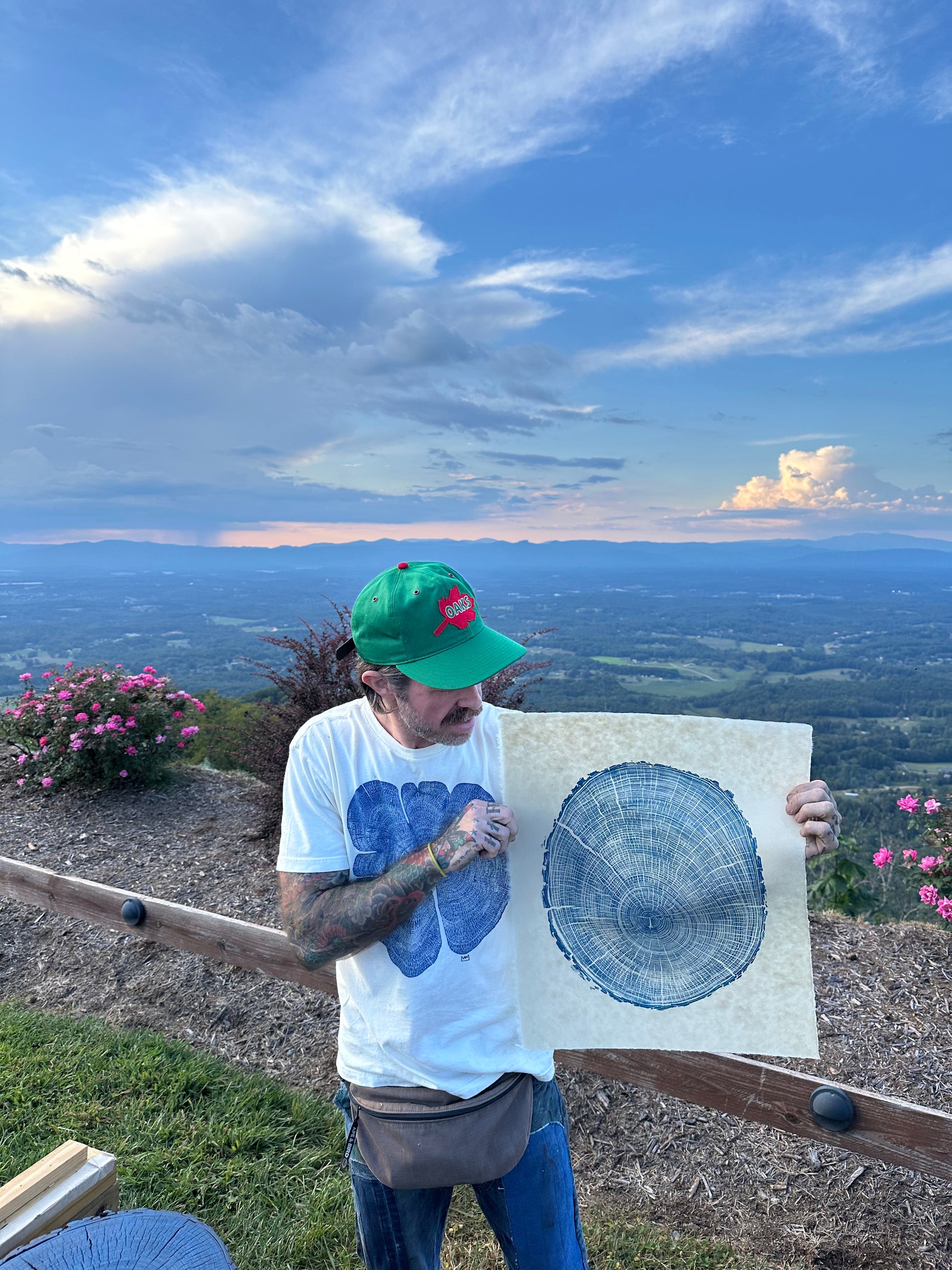A relief print of American Elm from Bakersville, NC (from the Casting For Hope Retreat Center, that came down during Hurricane Helene) on handmade paper using custom ink.