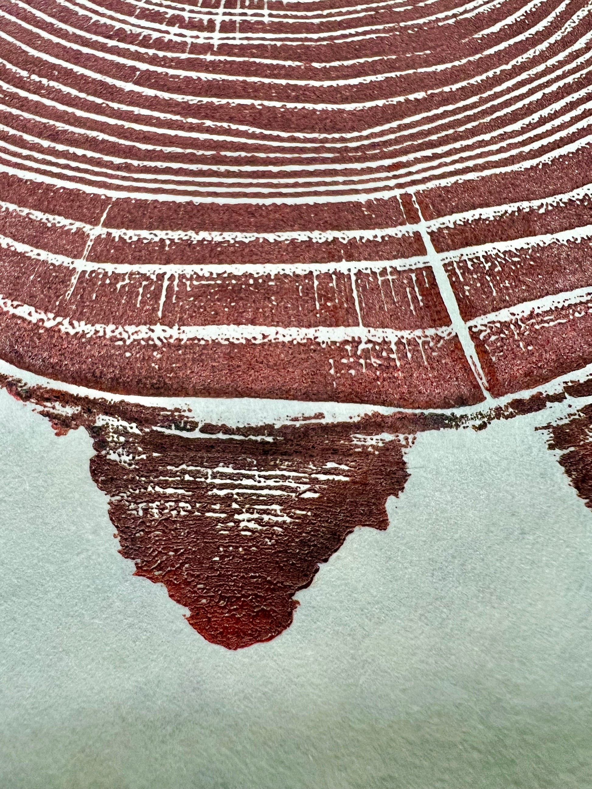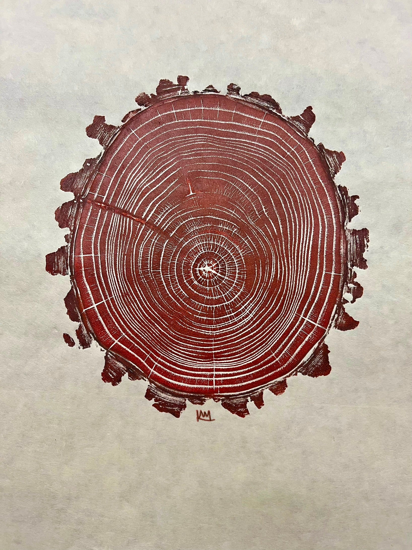 Relief print of a Black Locust from Western North Carolina that came down during Hurricane Helene. Printed on handmade paper using a base layer of black ink on the bark and a second layer of custom Reef Red.