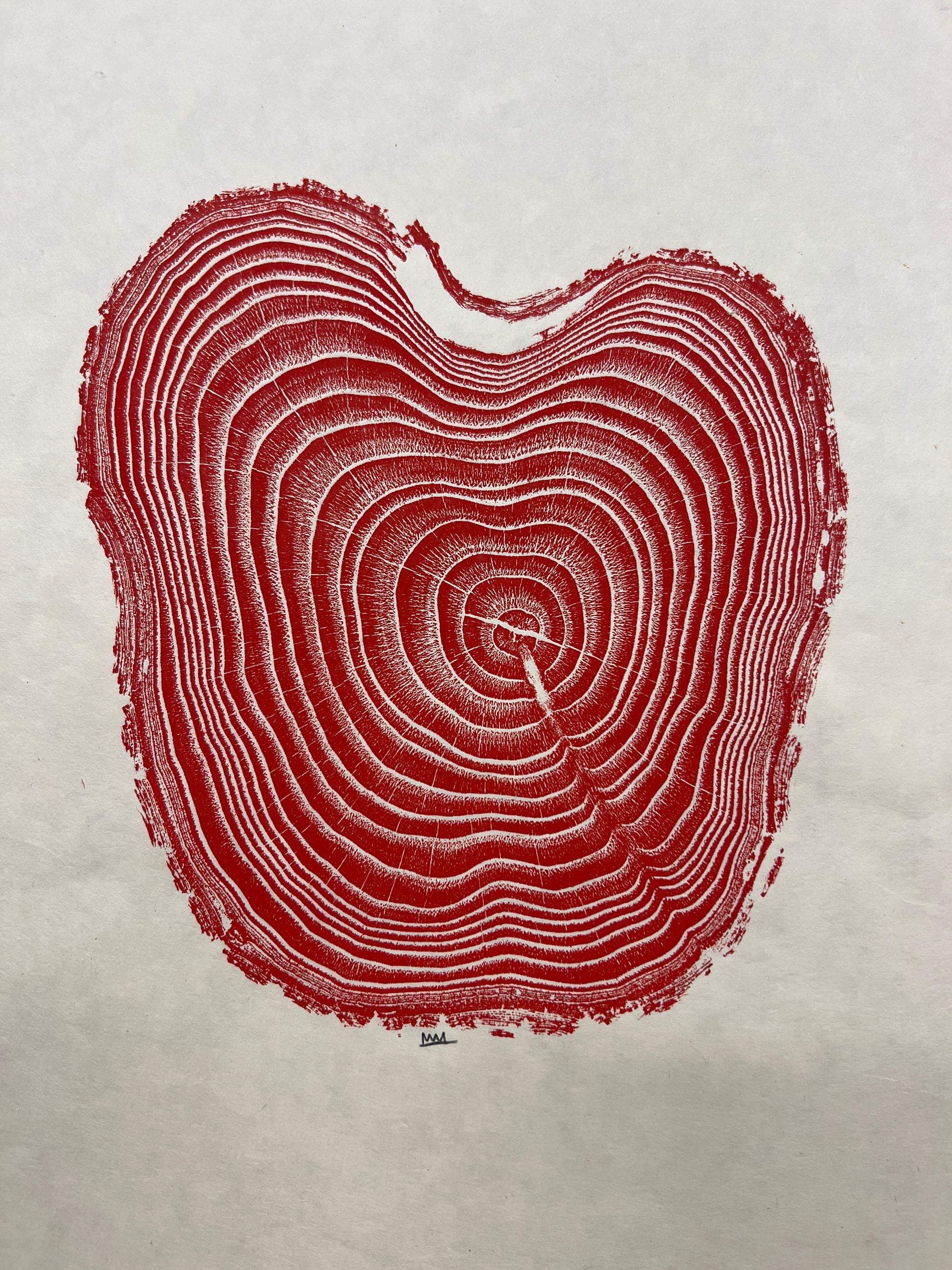 Relief print of a Chinese Chestnut from Peak, South Carolina that came down in the wake of Hurricane Helene on handmade paper using black ink.