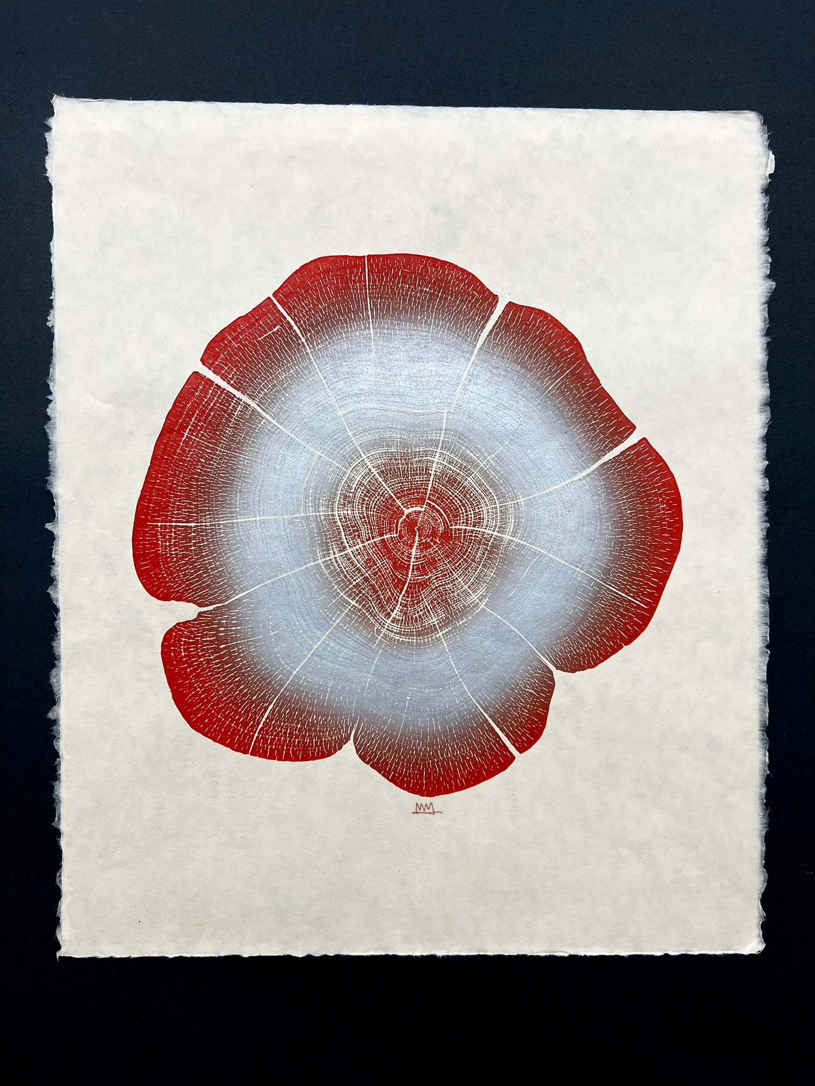 Relief print of Eastern Red Cedar on handmade paper using silver and red inks.